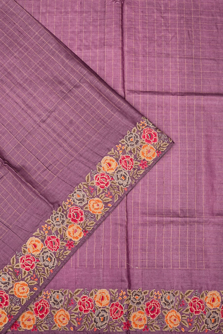 The violet saree is adorned with gold zari checks, adding a subtle sheen to its elegant design