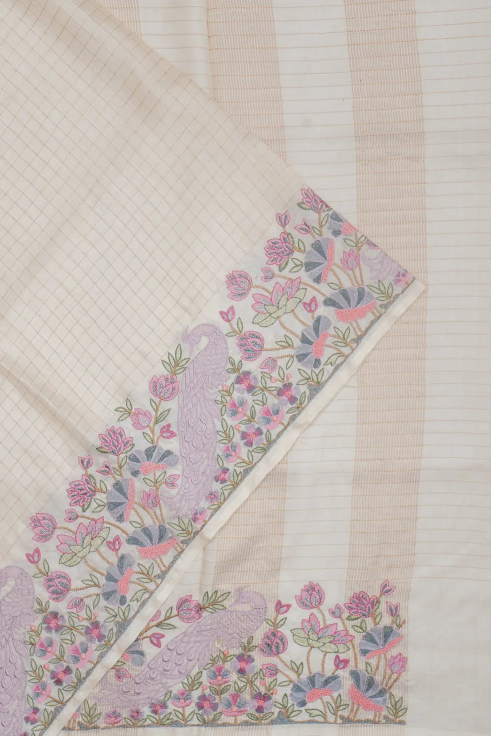 it's medium border is a canvas of artistry, featuring self multicolour embroidery With peacock motifs nestled in floral designs