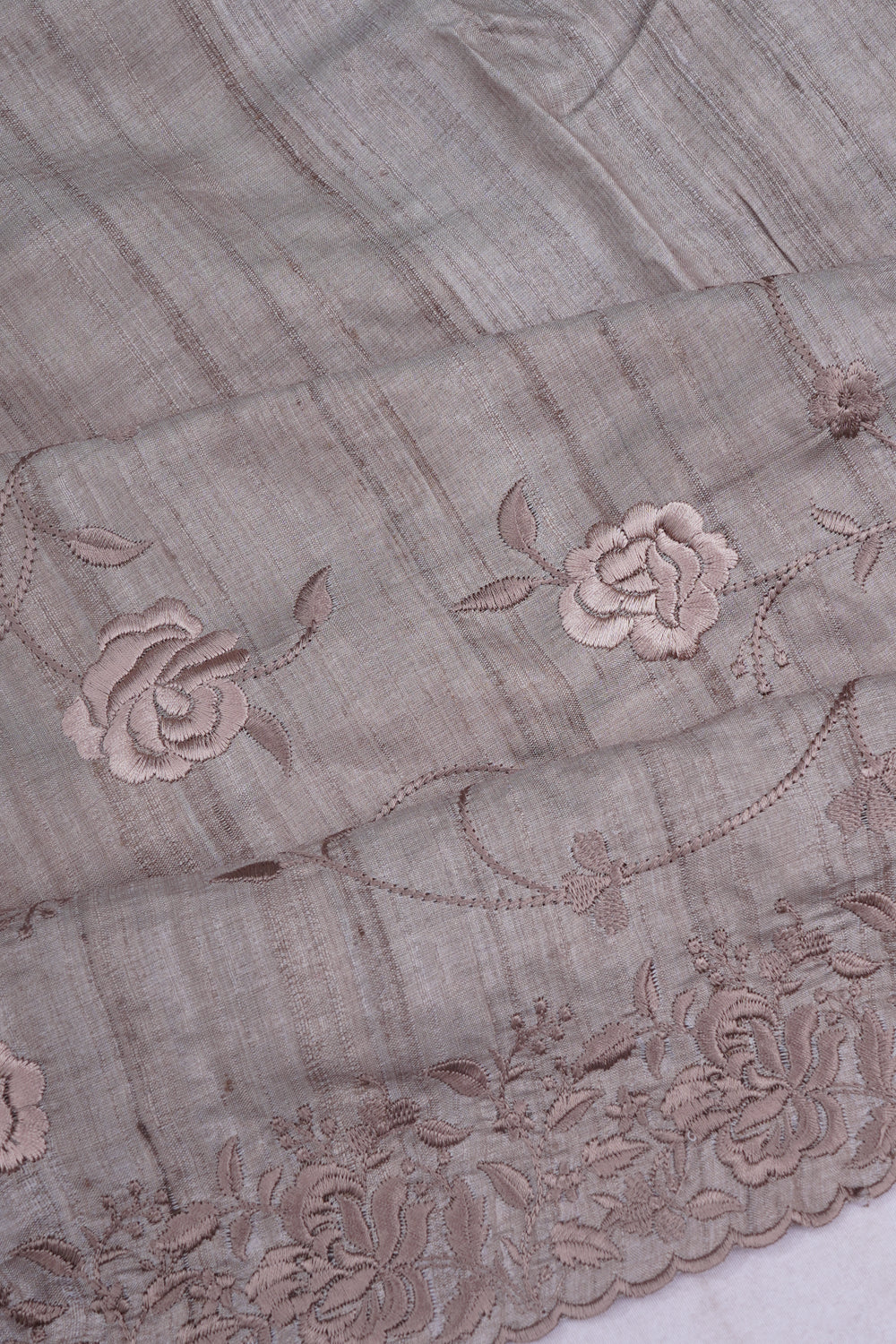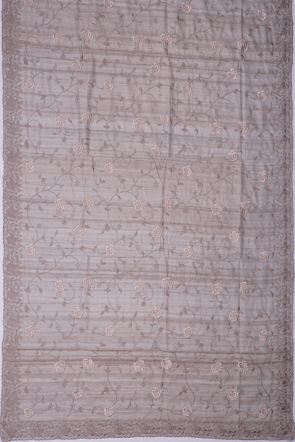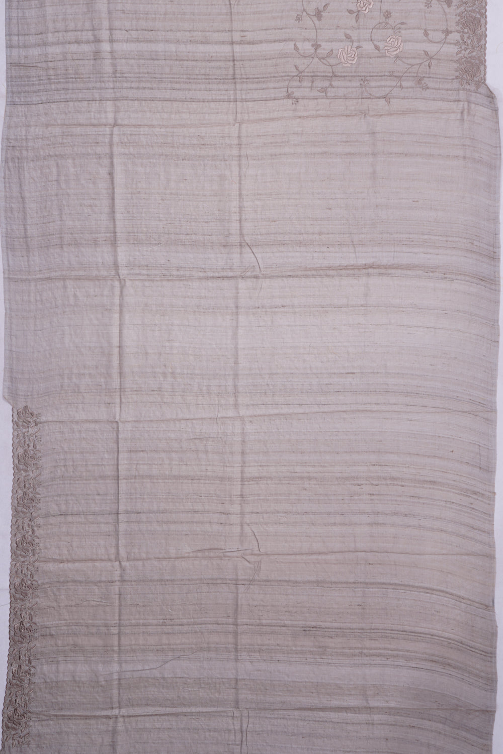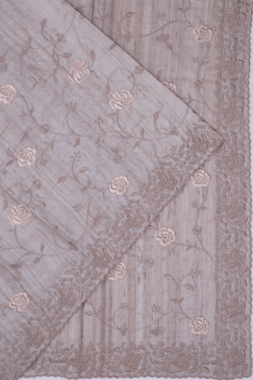 Soft grey tussar fabric embellished with delicate self-threaded embroidery throughout.