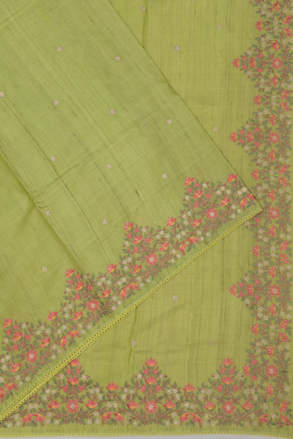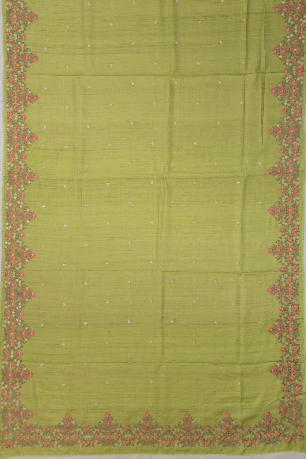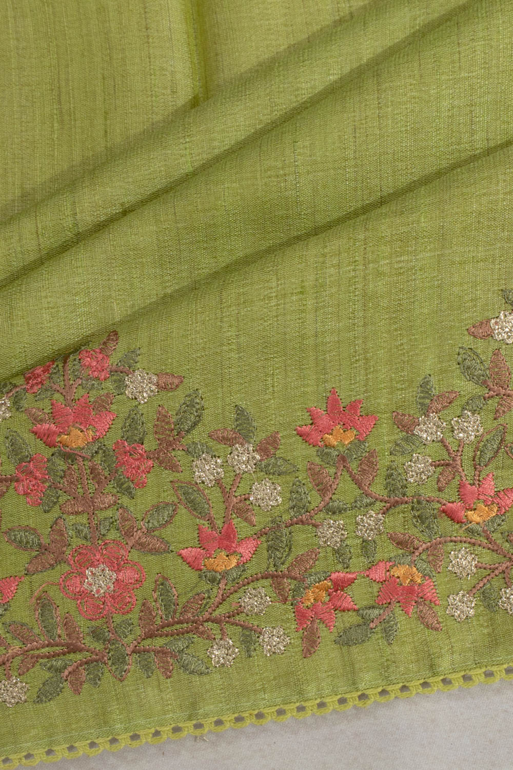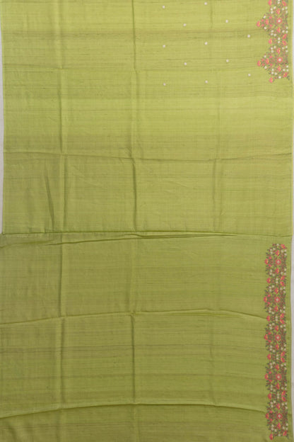 A rich green Tussar fabric featuring floral embroidery buttas, creating a textured and ornate appearance with scattered floral motifs.