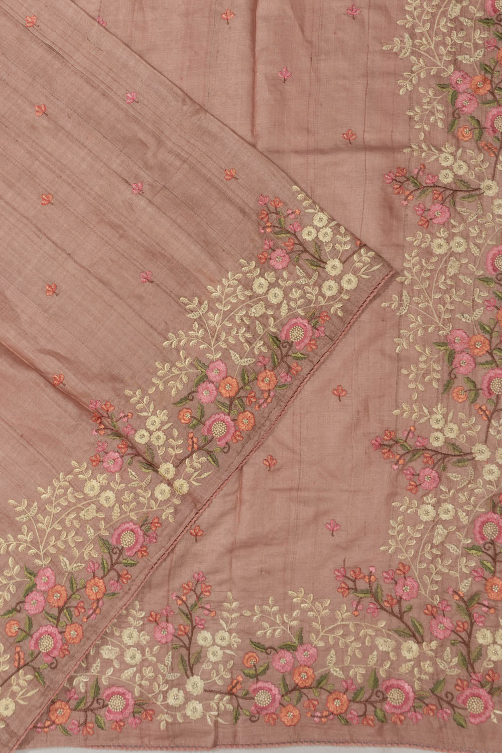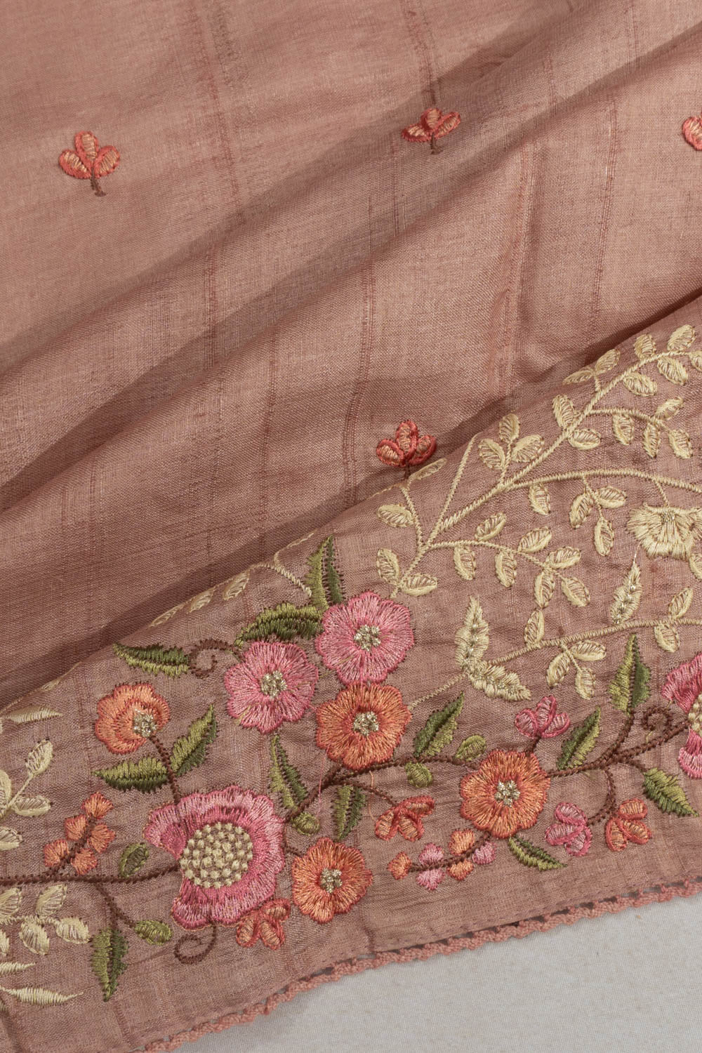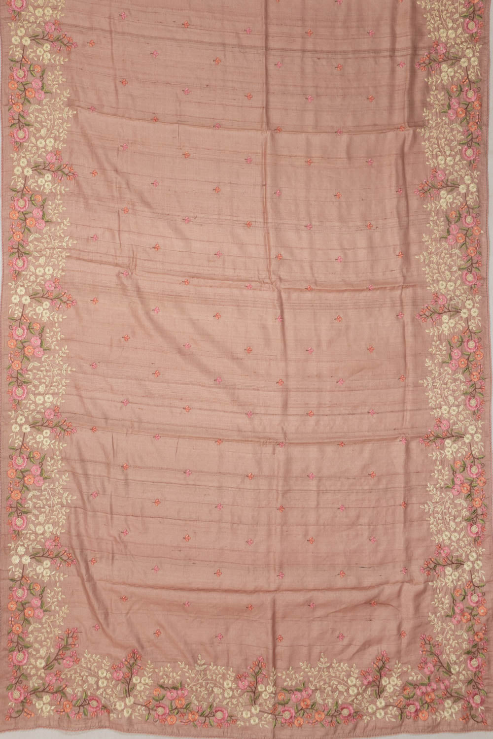 Soft pink Tussar fabric adorned with floral embroidery buttas, featuring intricate floral motifs throughout the saree for a refined and elegant look.
