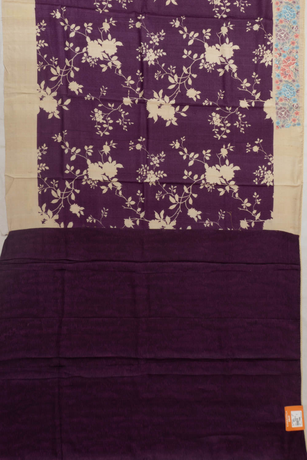 Dark purple Tussar fabric featuring a rich floral print, adding vibrant colors and a luxurious feel to the saree.