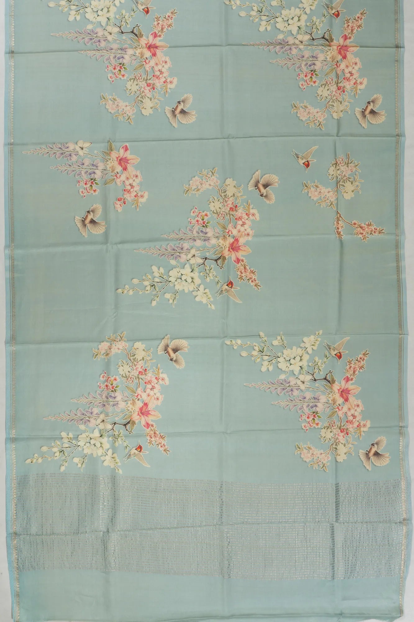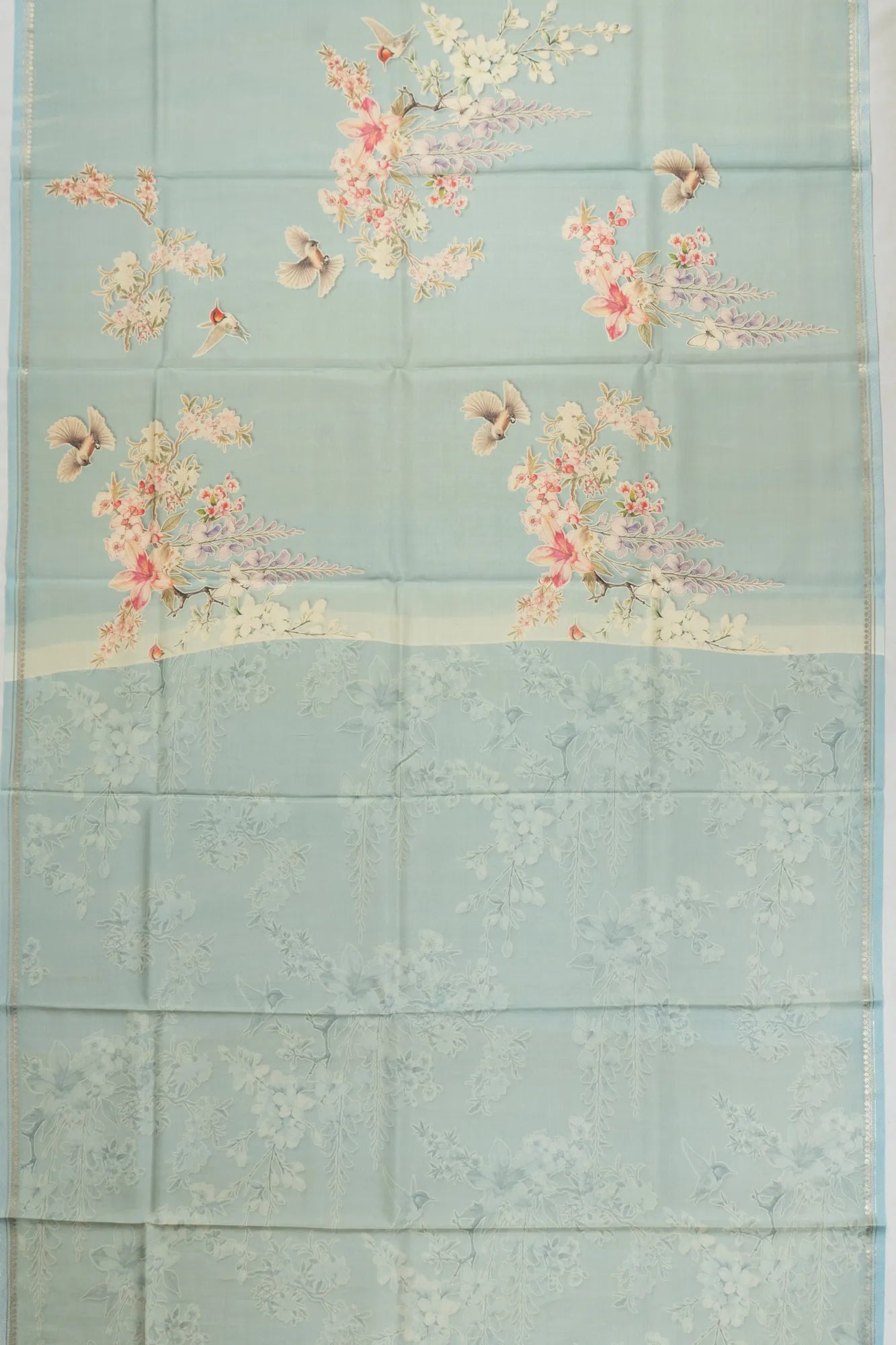 The saree's body is adorned with delicate floral prints and charming bird motifs, creating a picturesque landscape that captures the essence of traditional artistry