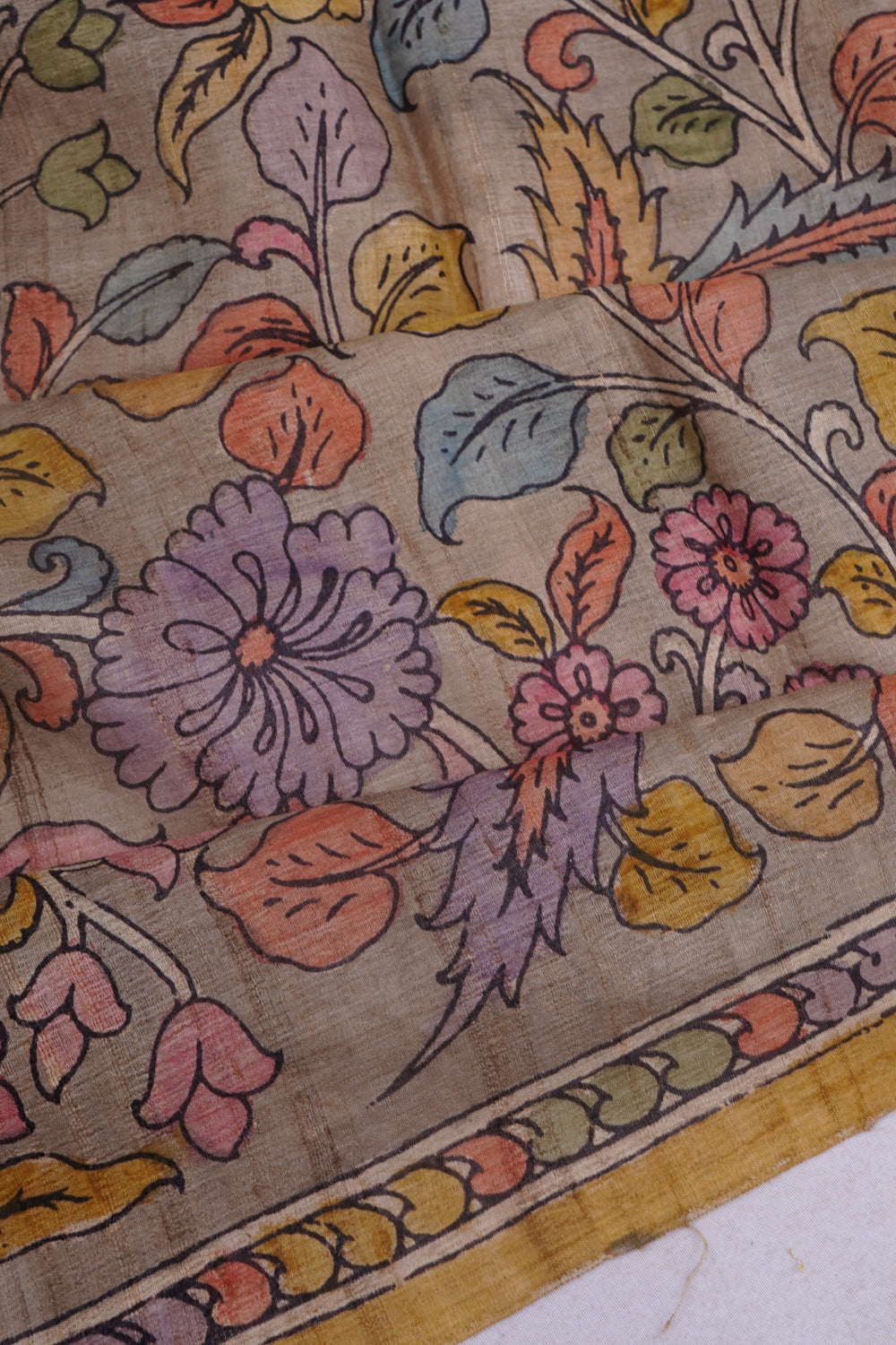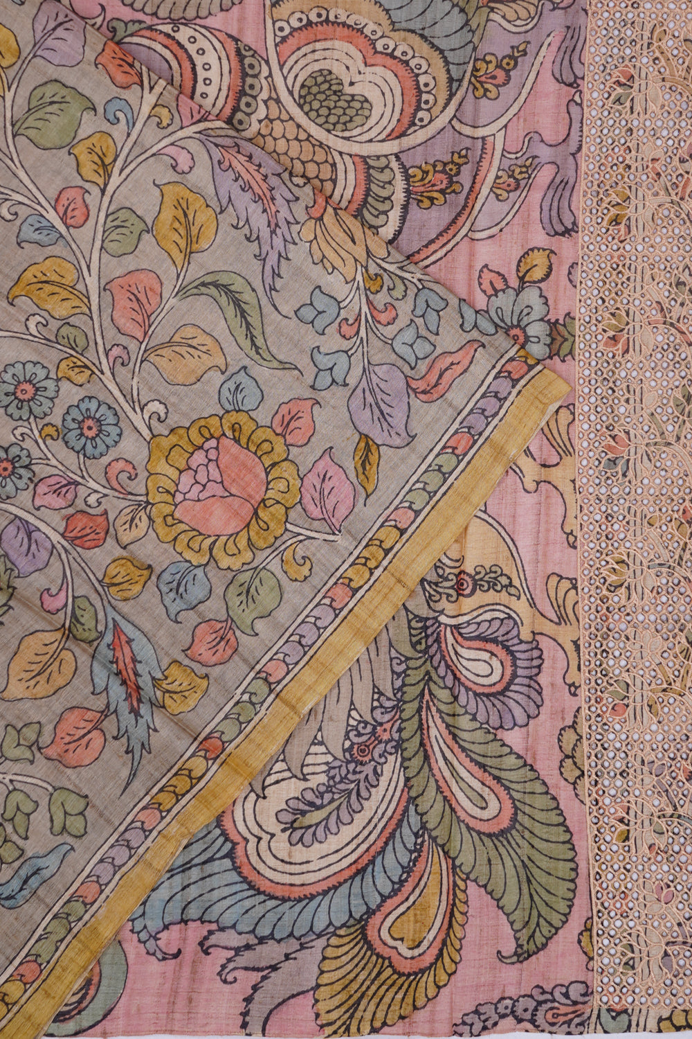 Elegant grey Tussar base adorned with intricate kalamkari motifs offering a graceful and earthy aesthetic.