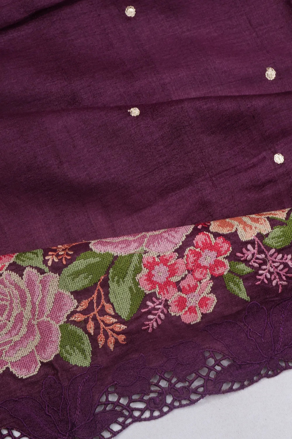 Tussar Mirror Butta Purple Saree With Embroidery And Cut Work Scallop Border