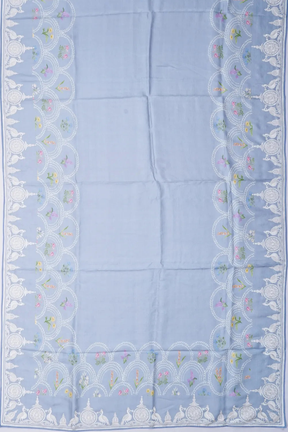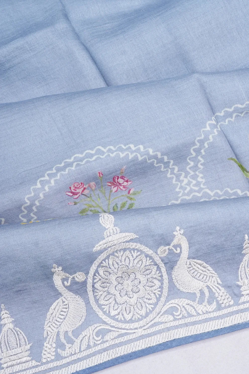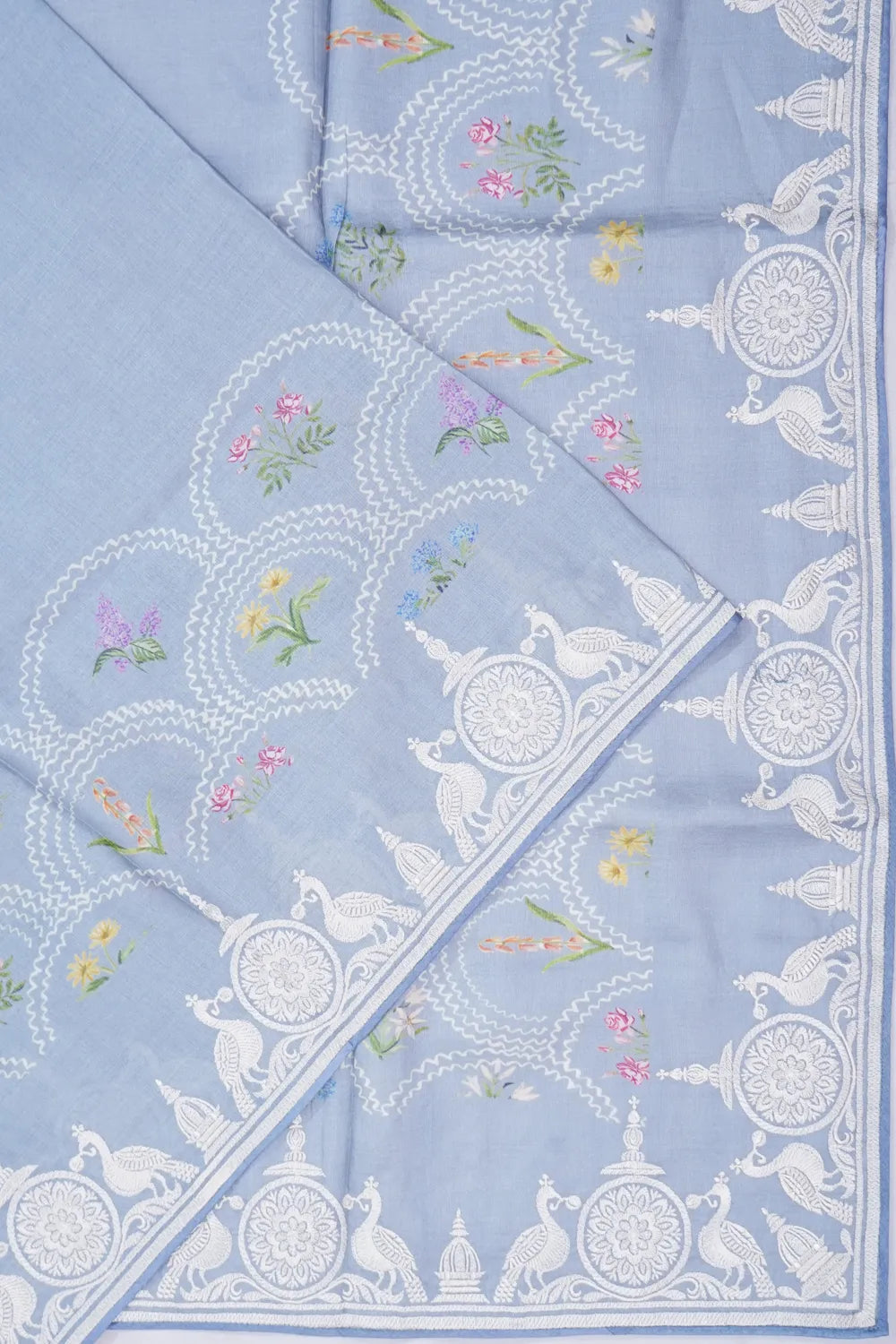 The border features a harmonious blend of self floral prints, peacock motifs, and intricate floral vines, creating a subtle yet sophisticated finish
