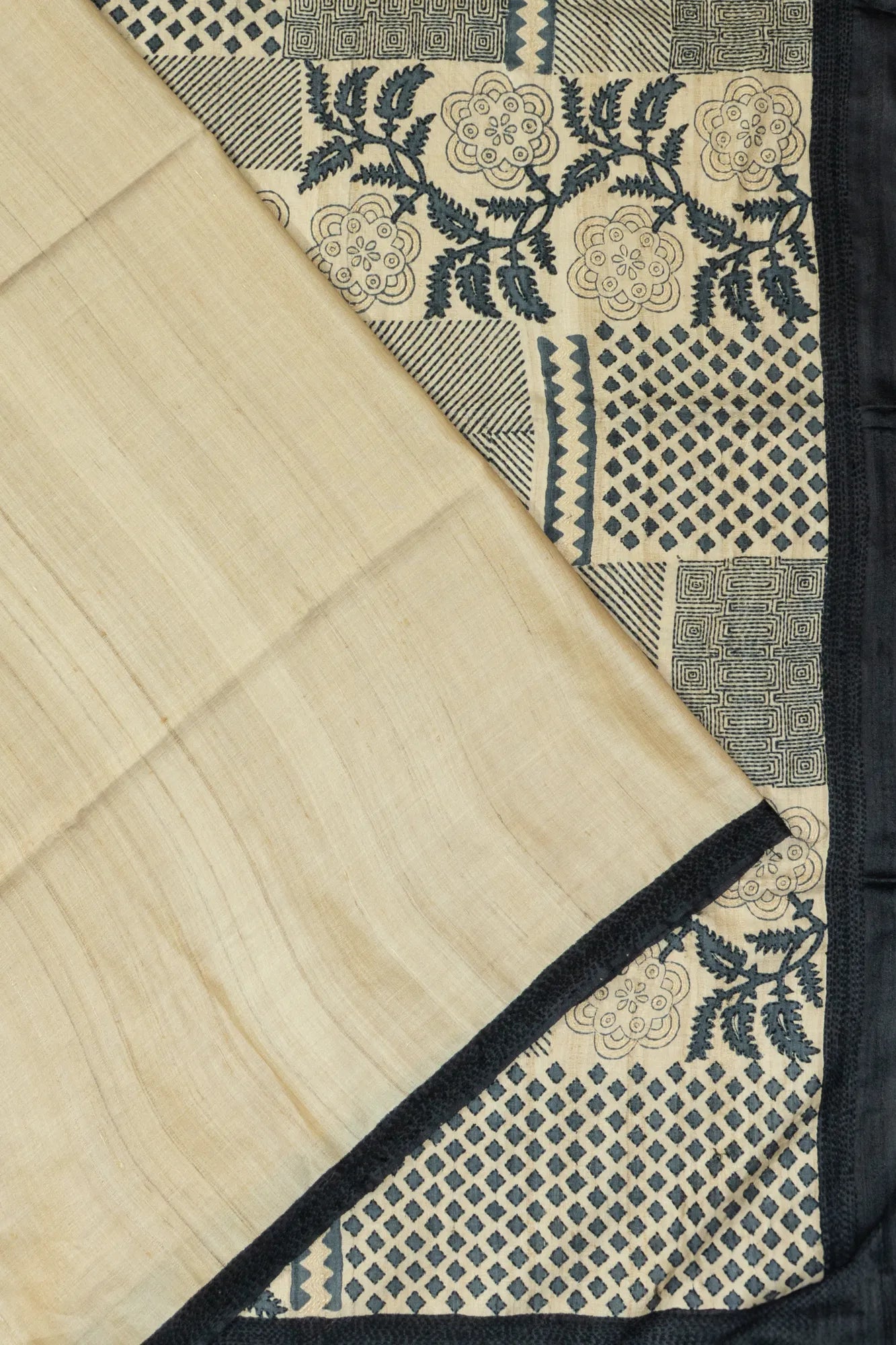 The saree pure tussar silk body offers a luxurious feel and a classic cream hue that speaks of timeless grace and simplicity
