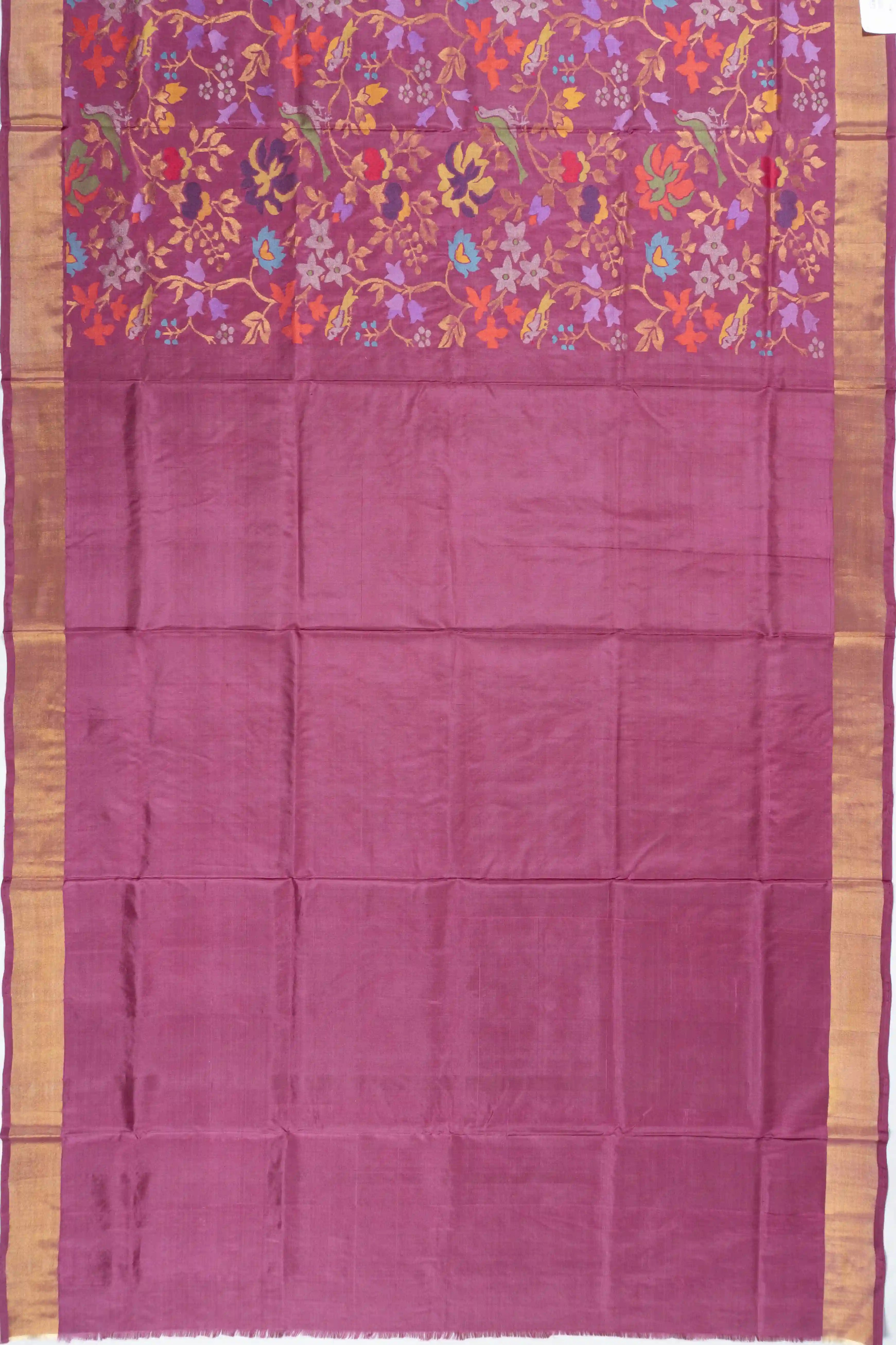 The pallu unfolds with self gold zari floral vines, a testament to timeless elegance and meticulous craftsmanship