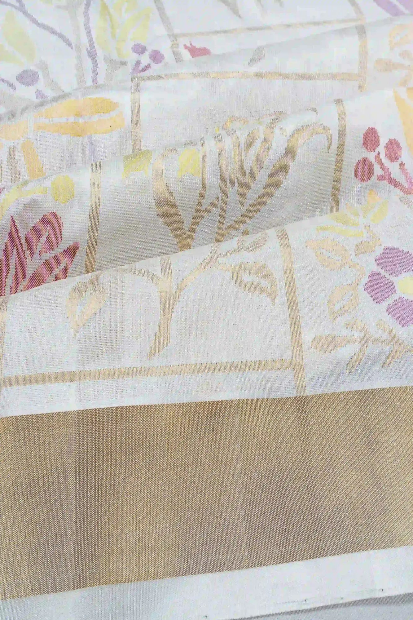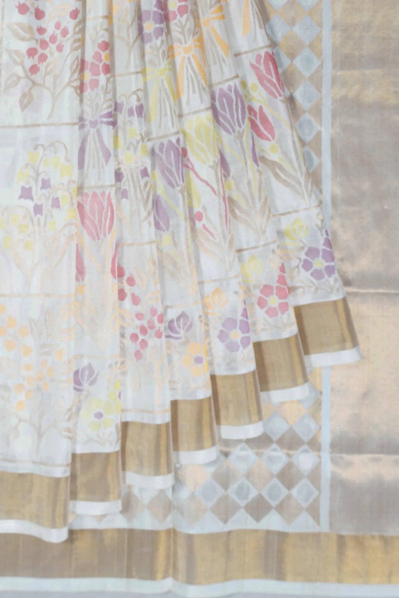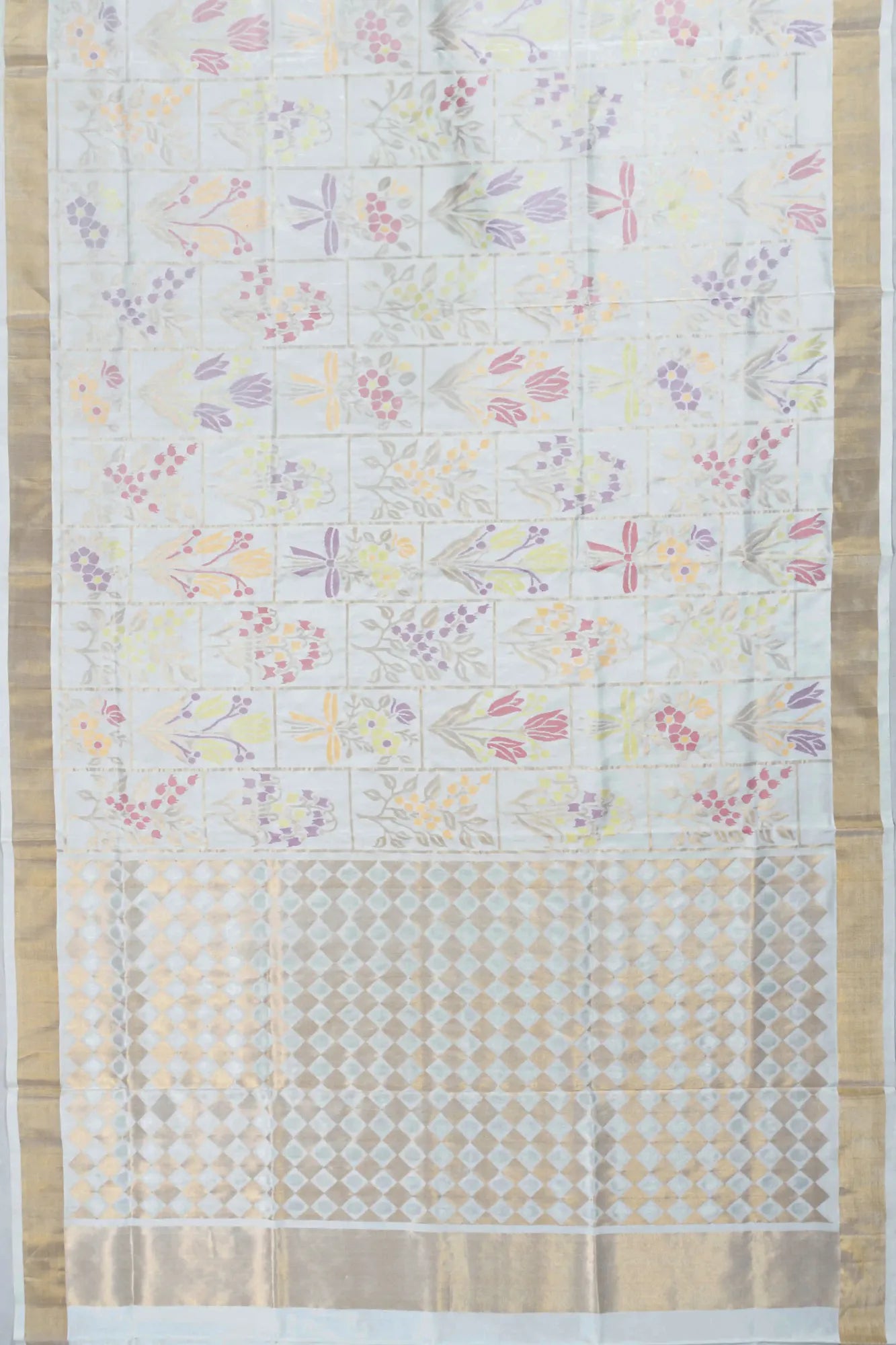 The saree's body is adorned with jamdani gold zari floral brocade, creating a delicate dance of shimmering motifs against the pure silk backdrop