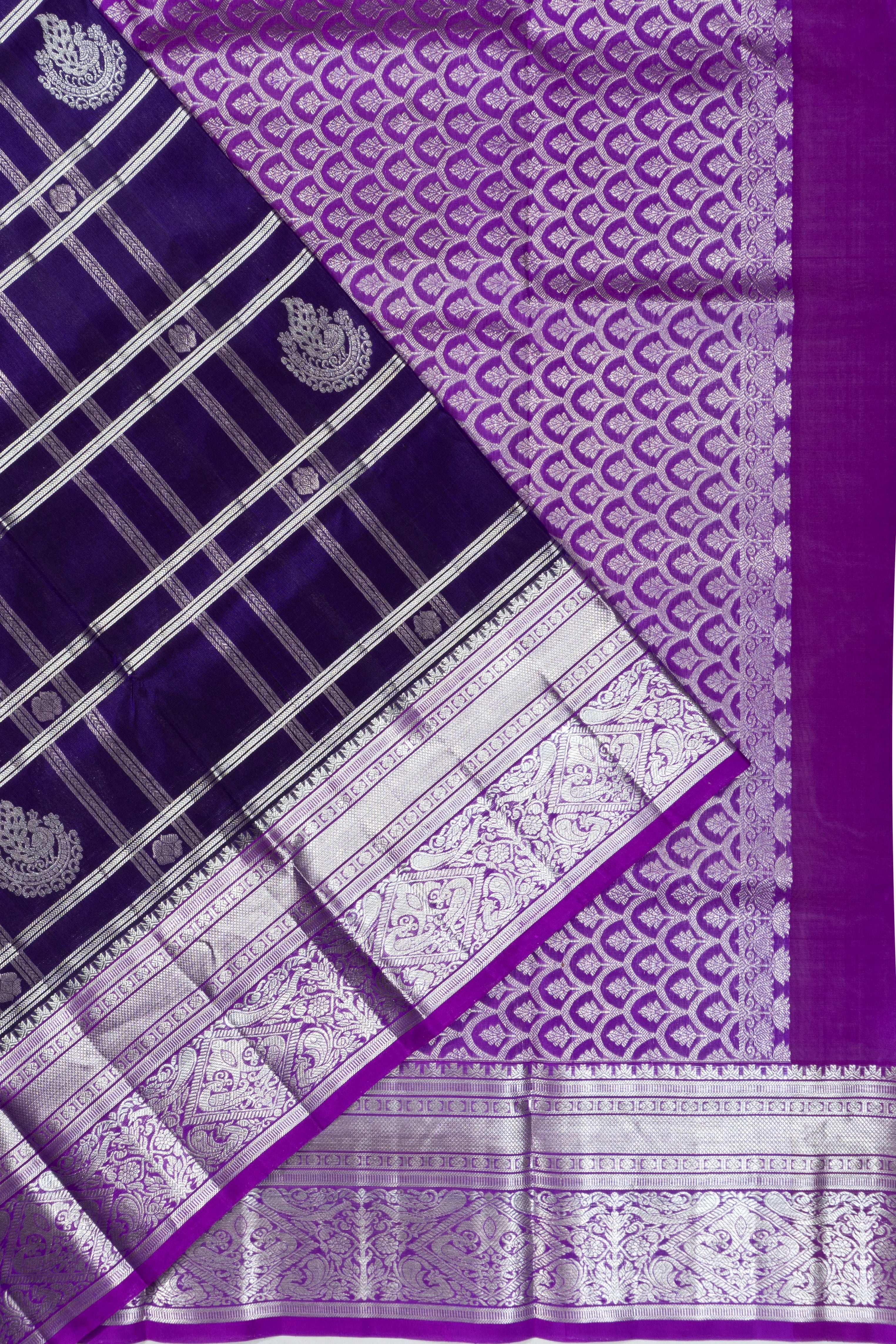 The body features a sophisticated interplay of silver zari checks with delicate floral peacock motifs, creating a captivating dance of tradition and design
