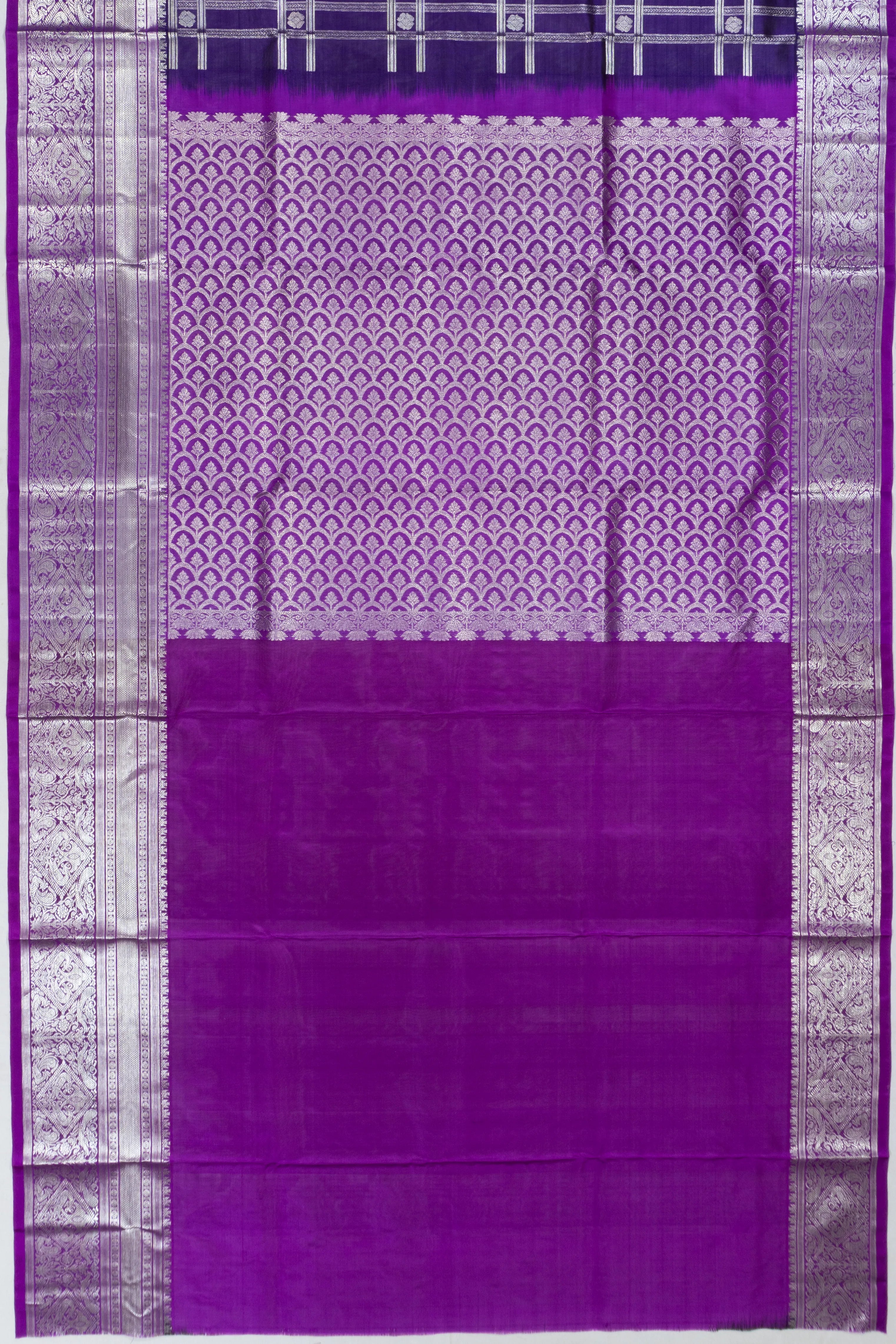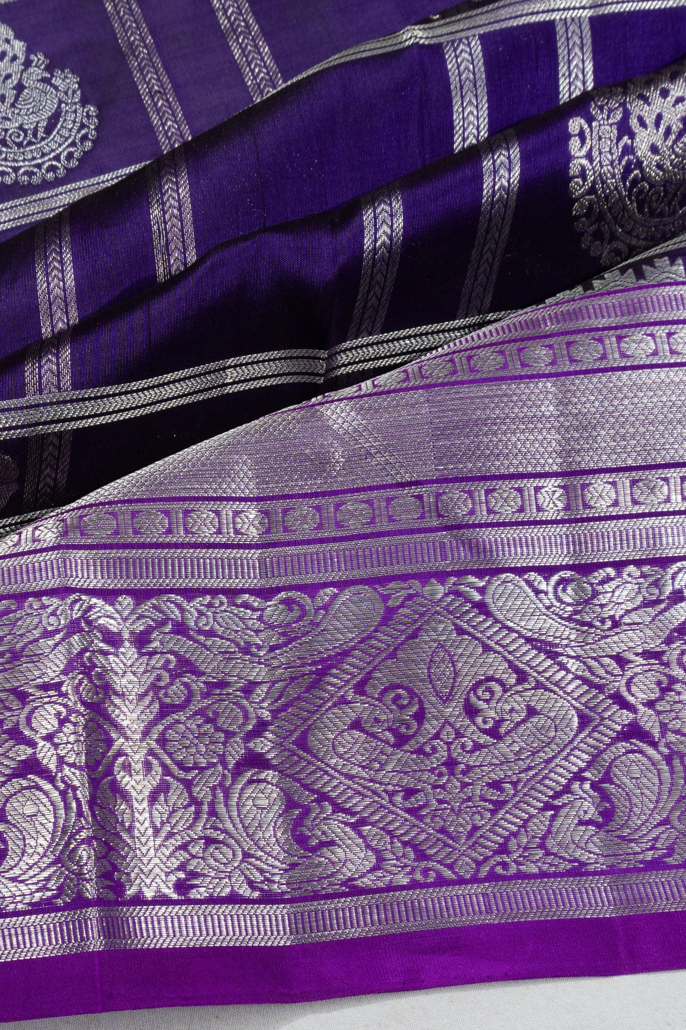 A contrasting silver zari brocade border in rich purple frames the saree, embellished with enchanting peacock motifs nestled within floral vines, adding a touch of regal allure
