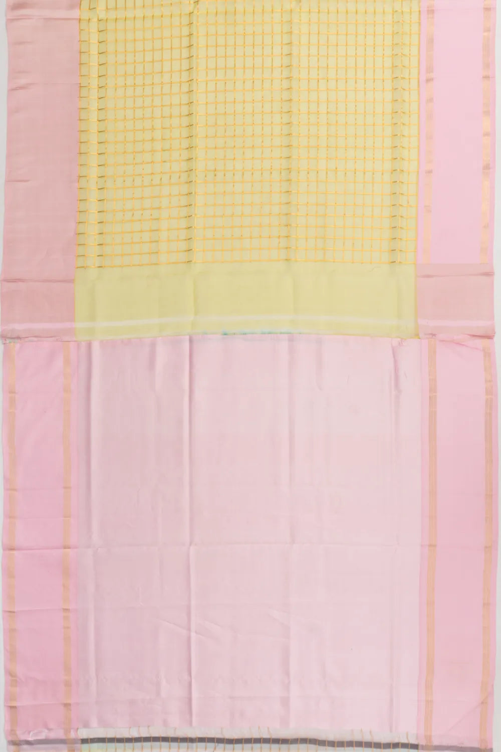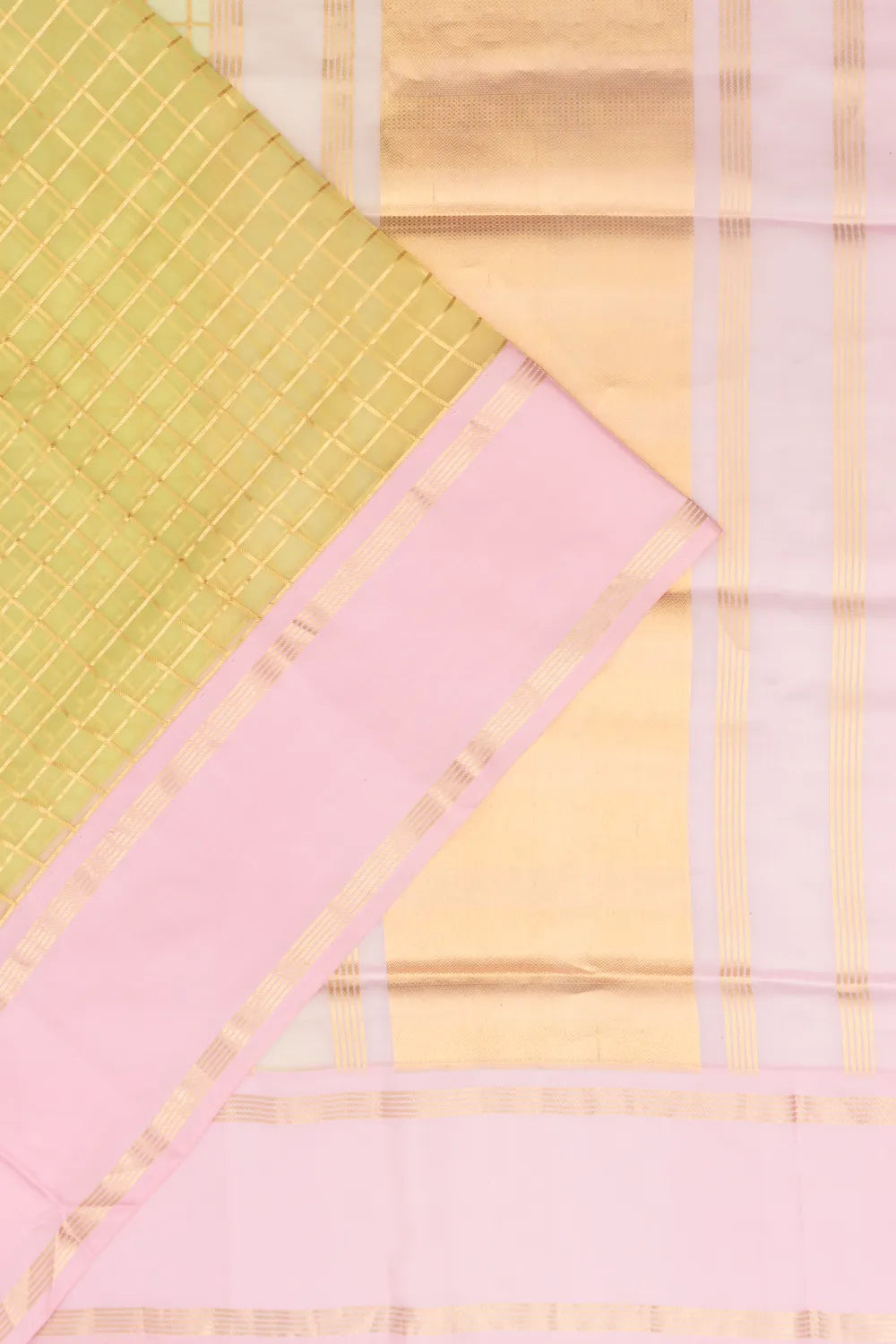 Adorned with delicate gold zari checks, this saree embodies subtle elegance on an airy Kora Organza base, giving it a light and graceful appeal.