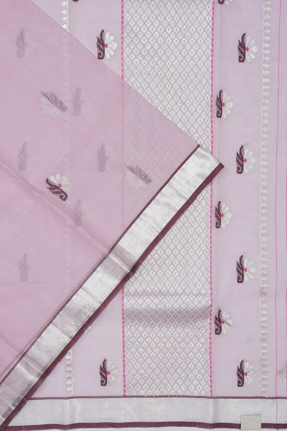 The body of the saree features silver zari floral buttas with subtle brown highlights, creating a graceful interplay of color and shimmer