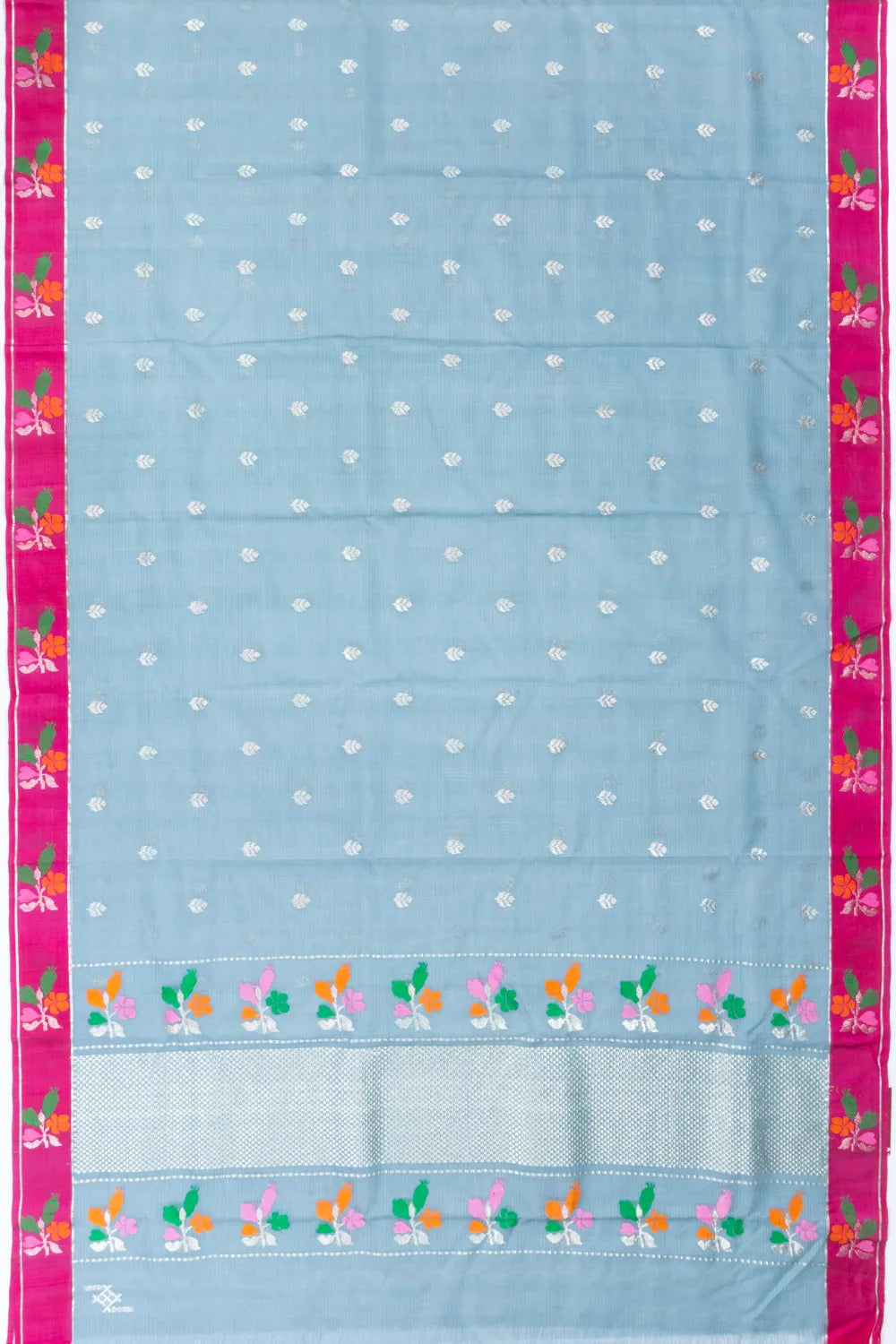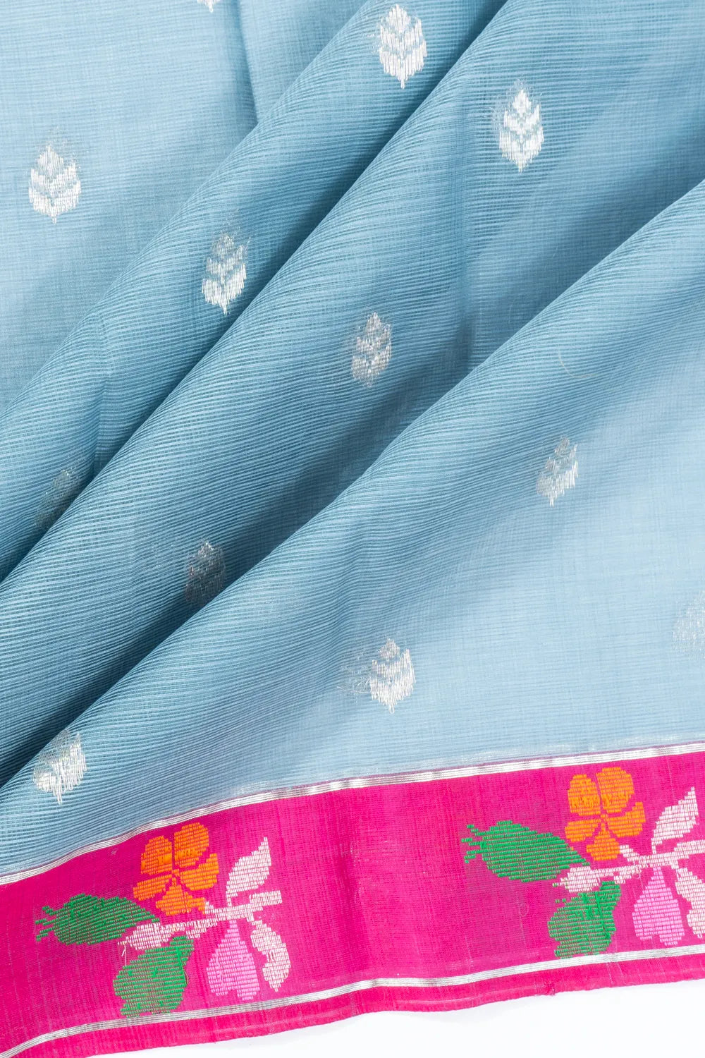 In a dreamy Powder Blue, this Zari Kota Cotton saree is adorned with silver zari floral buttas, lending a gentle shimmer.
