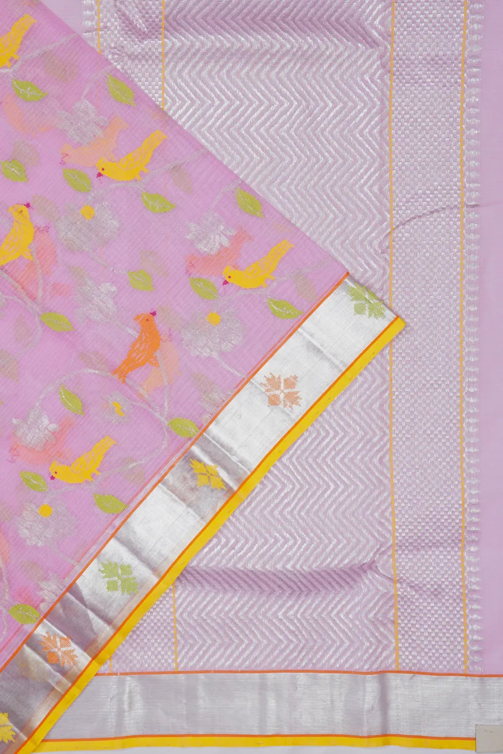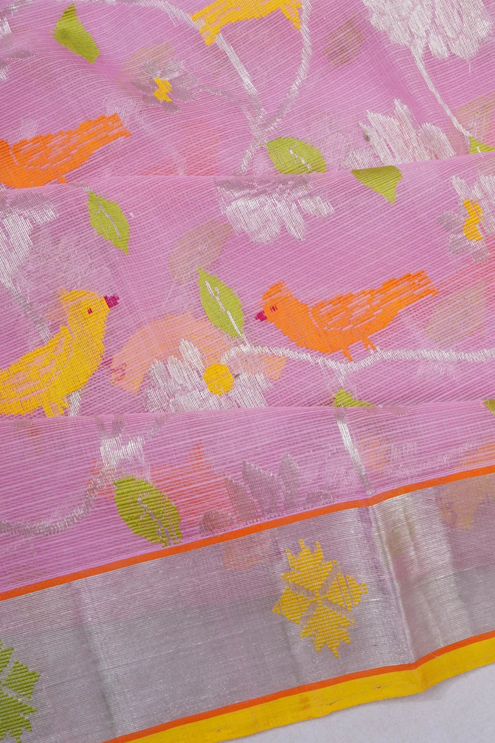 The saree features a self silver zari kaddi border, embellished with intricate floral motifs and a subtle yellow edge, adding a touch of sophistication to the ensemble
