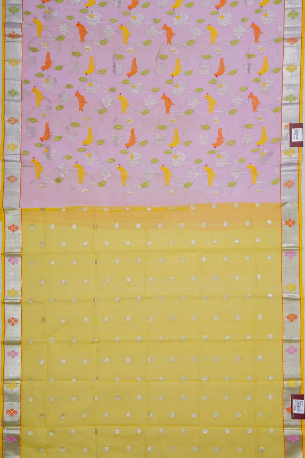Paired with a contrasting yellow blouse, adorned with silver zari polka dot buttas and zari borders, this saree offers a refined and cohesive look
